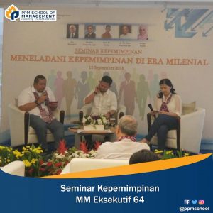Sabtu (15/09) hari ini telah diadakan seminar kepemimpinan oleh mahasiswa MM Kelas Eksekutif Angkatan 64 di Executive Lounge, PPM School of Management. Seminar ini menghadirkan berbagai pembicara lintas profesi dengan mengangkat tema “Meneladani Kepemimpinan di Era Milenial”.